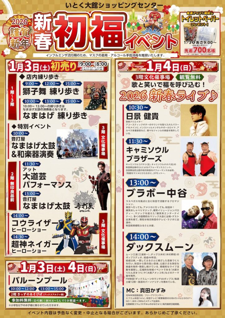 ライブ・イベント 2026年1月4日(日) いとく大館ショッピングセンター 2026 新春ライブ けんき 2025-12-25 2026年1月4日(日) 10:30〜「いとく大館ショッピングセンター 2026 新春ライブ」への出演が決定しました!新年のはじまりに、みなさんとお会いできることを楽しみにしています! イベント ライブ 大館市 新春イベント 秋田県 アルバム販売中! 配信限定アルバムのCD化にあわせて、ネットショップ「HIMOROGI STORE」をオープンしました。日景健貴の1stアルバム『美的情操』、2ndアルバム『Localize』、3rdアルバム『アーカイブ』、4thアルバム『夢解』を販売中です。 HIMOROGI STOREをチェック!